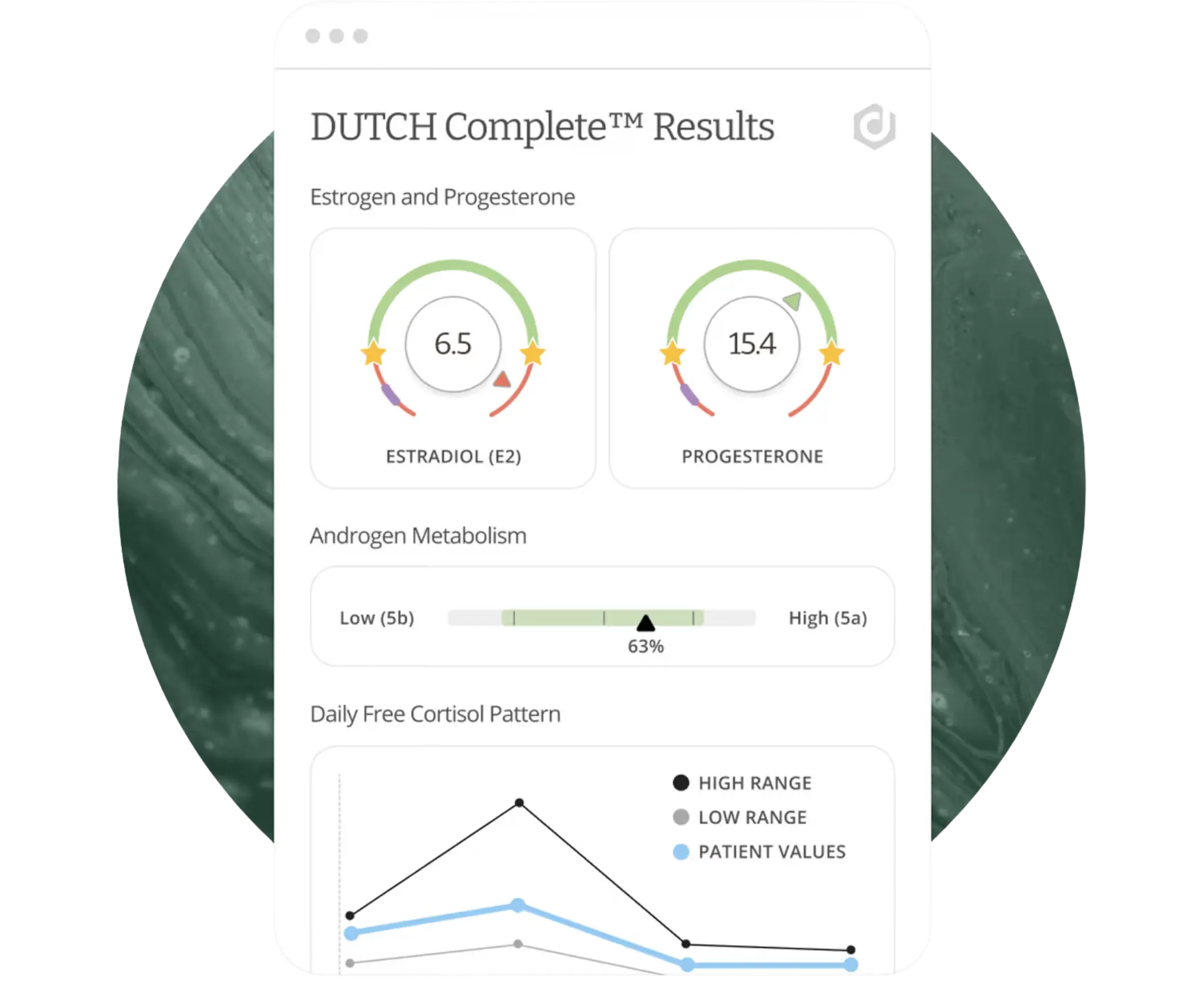 An at-home dried-urine panel that maps sex and adrenal hormones plus metabolites, cortisol rhythms, melatonin, and markers of nutrient/oxidative-stress status.