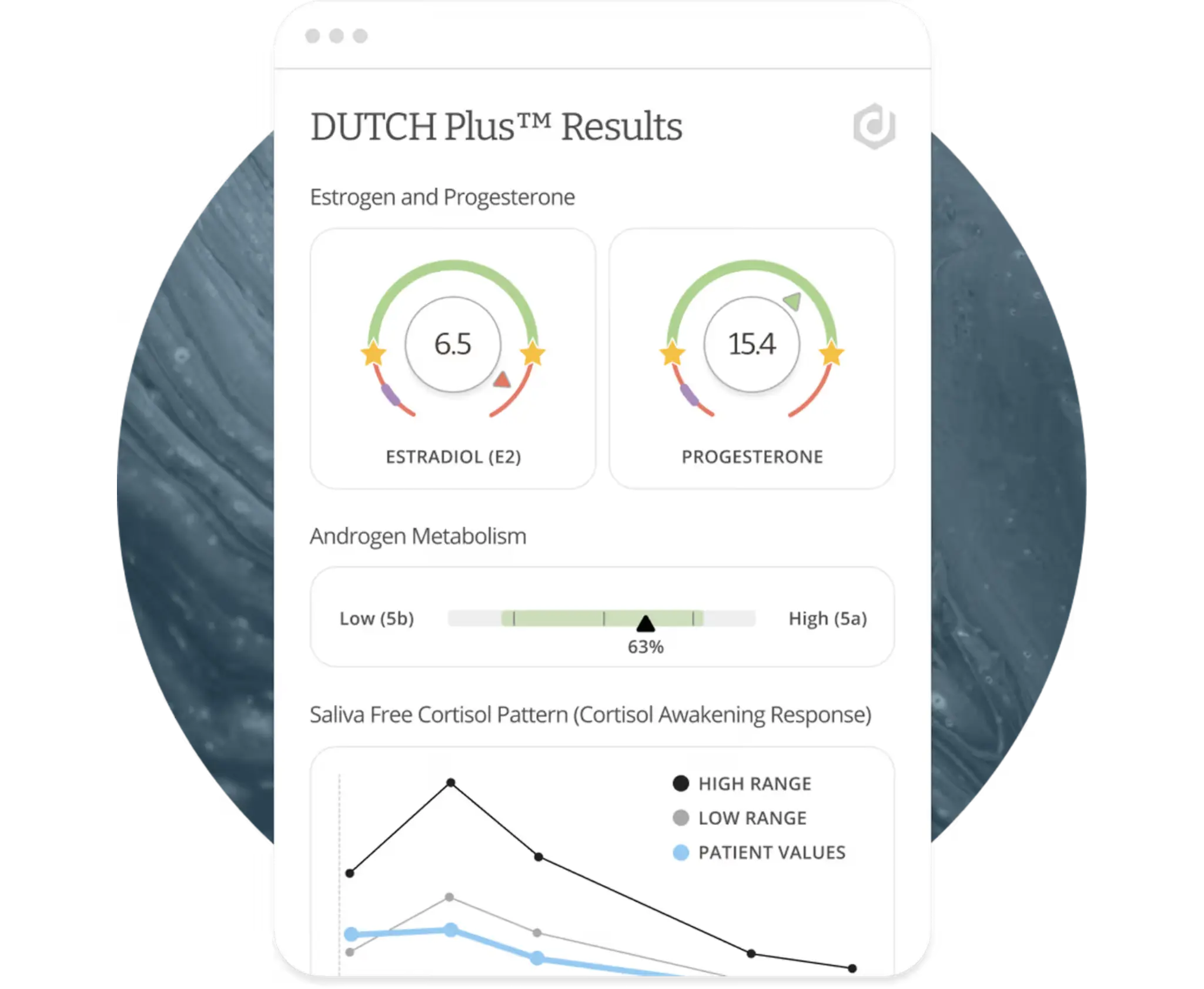 An at-home hormone and stress test that maps your sex hormones and daily cortisol pattern so you can understand what’s driving your energy, mood, sleep, and weight.