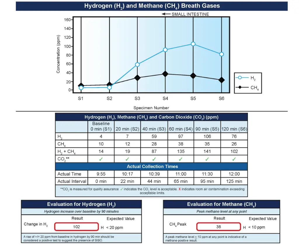 Ship + Receive ResultsShip your breath samples using the prepaid shipping materials. Results are typically available within 7 days with a detailed report showing hydrogen and methane gas levels over time, interpreted according to North American consensus guidelines.